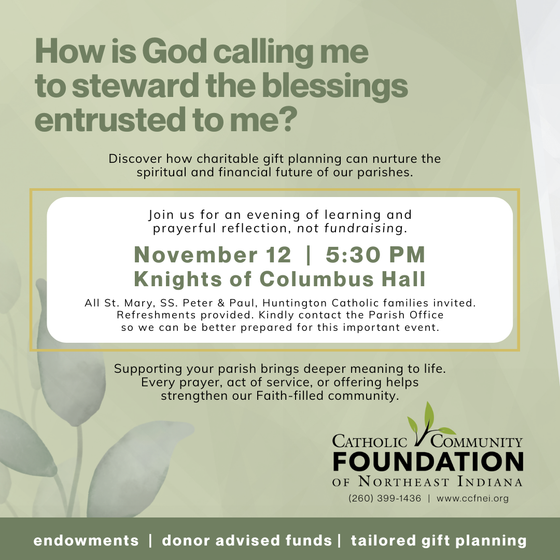 There is a terrific way to get a large tax break and support our parishes and school through donations to our diocesan SGO (“Scholarship Granting Organization”). The SGO of Northeast Indiana (www.sgonei.org) supports Huntington Catholic School.