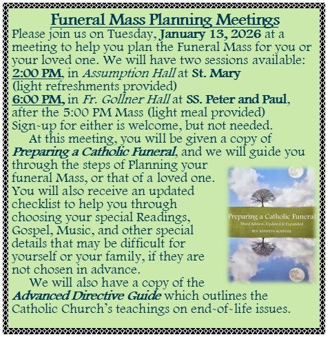 The “Now and at the Hour of Our Death” ministry is a NEW ministry being formed at the request of Fr. Tony to support the spiritual needs of those near death and their families within the Huntington County Catholic Community. This ministry will also provide timely assistance when planning a Catholic funeral. We are looking for interested men and women from either parish to be engaged as contributing members of this worthy ministry. If you feel called to serve your brothers and sisters in Christ in this manner and would like to be a member of this ministry or have questions, please contact Doña Reust 574-527-1208.