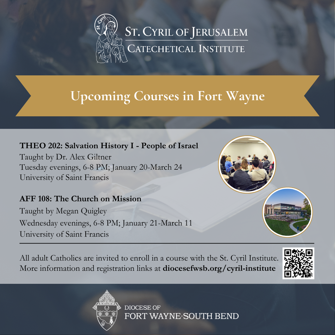 Beginning Dec 8 through January. This is a kerygmatic series featuring Chris Stefanick and various experts exploring life’s biggest questions from a Catholic perspective on topics of death, sorrow, happiness, science & faith. Designed to encourage honest conversations & deeper reflection on meaning & belief. Open to non-Catholics and fallen away Catholics. Sign-up sheets at the entrances of both churches or contact Drew 260-224-0522 dstuart@huntingtoncatholic.org.