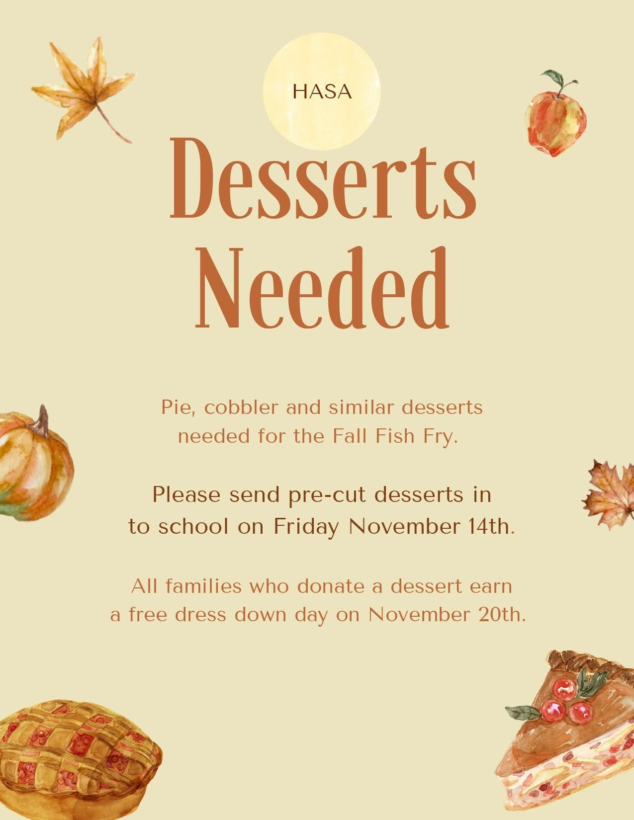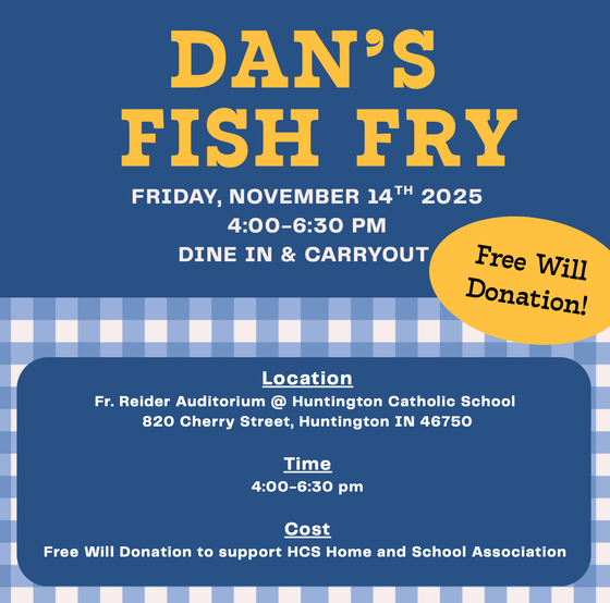 Please join us Friday, November 14 at 4:00 - 6:30pm for Dan's Fish Fry, Dine-in or Carryout. Free Will Donation to help support HCS Home and School Association. Located in Fr. Rieder Auditorium at HCS.