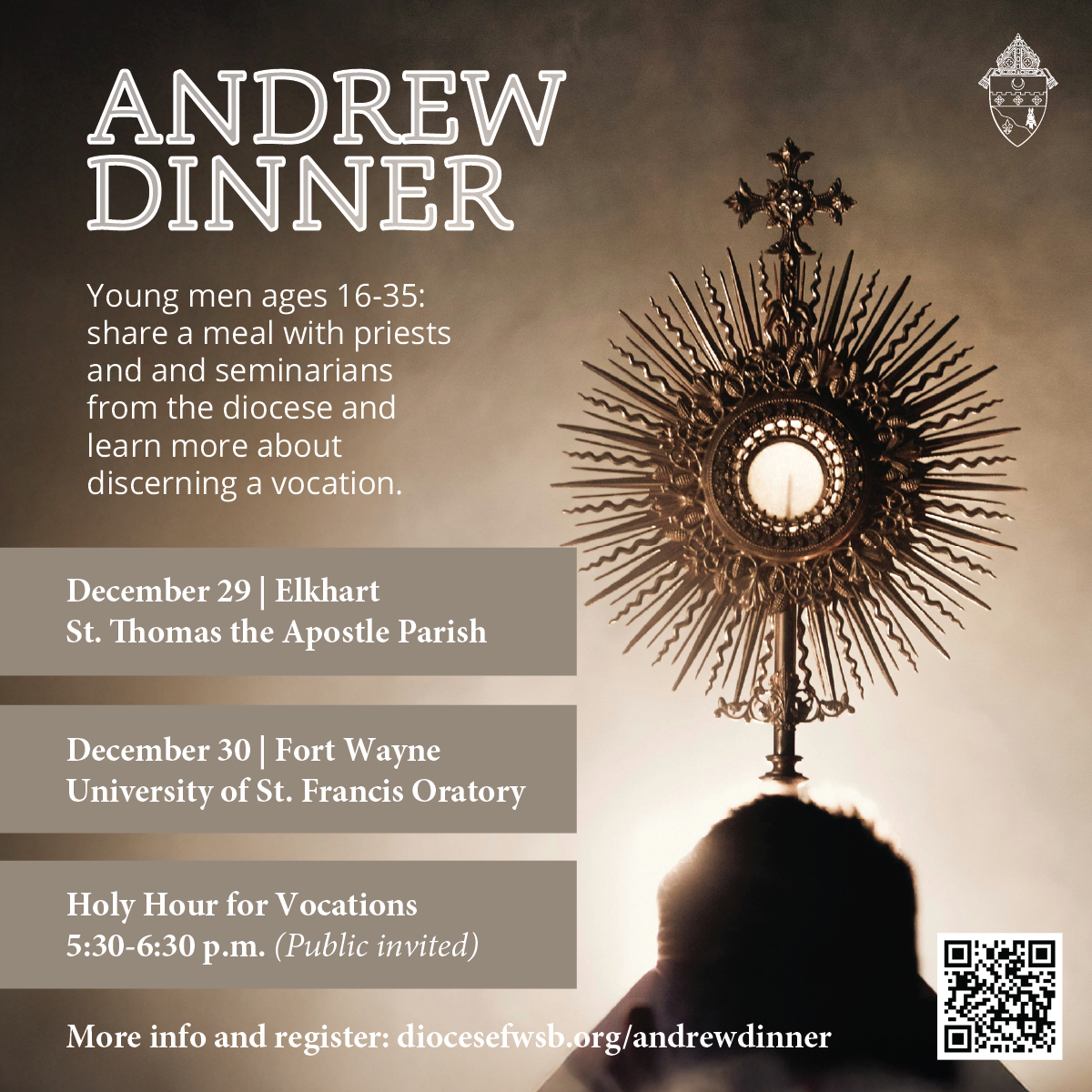 On SAT, Dec. 13, bring your wrapped and labeled gifts to the St Mary school gym door between 9:00-11:00am so that we may distribute them later in the day to the families. If you do not wish to adopt a family, but wish to give a financial contribution, write “St Vincent” on an envelope and drop it in the collection basket in the next few weeks. For information, contact Jim Tester at jim.testersvdp@gmail.com or Pat Mettler at 260-341-4579.