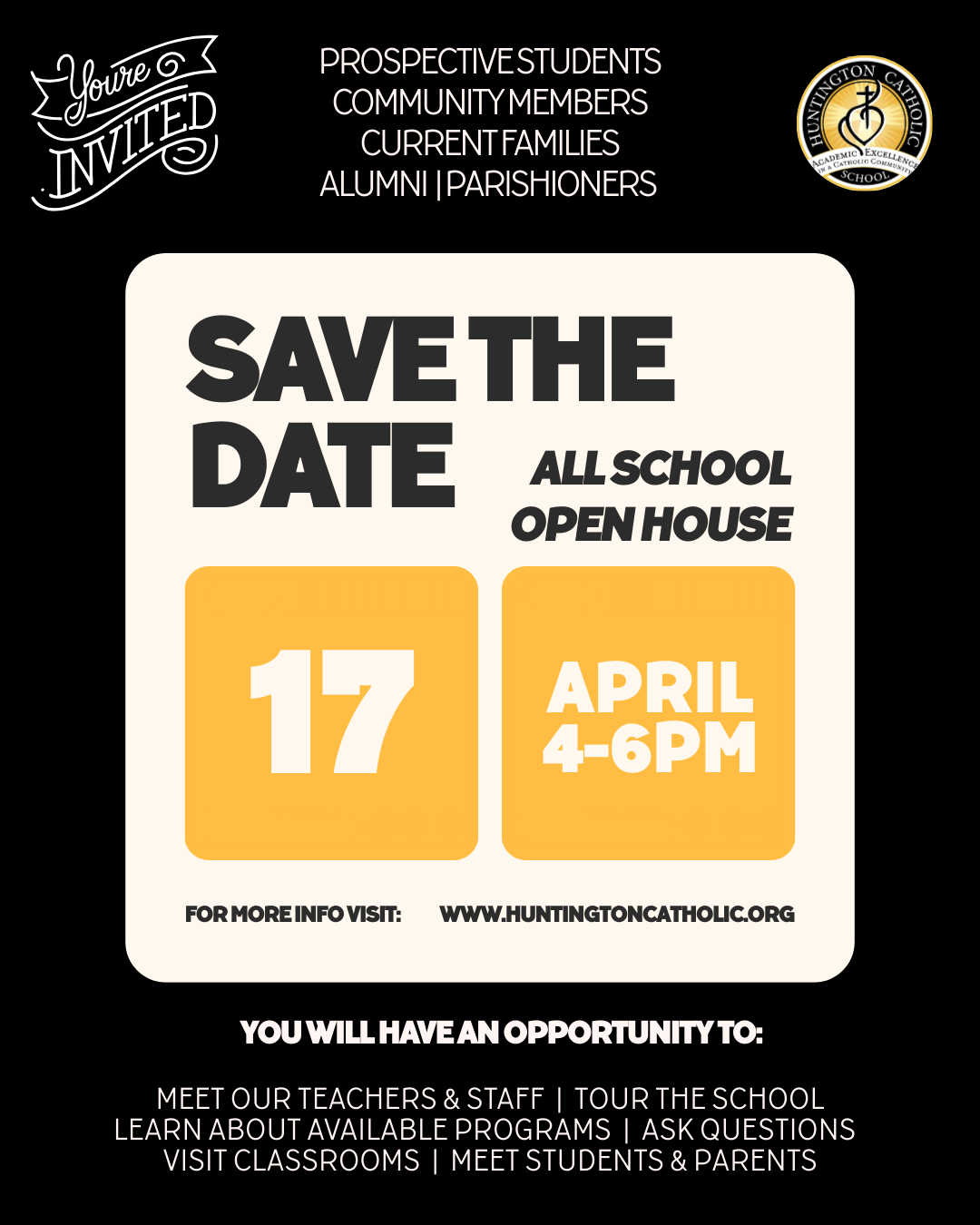 Come out & join us this Friday, April 17 - 4:00-6:00pm! If it’s been a while since you have visited Huntington Catholic School, come to the HCS OPEN HOUSE (Door #1) and check it out, as well as view the school art projects on display before or after you enjoy the Fish & Tenderloin Dinner (St. Mary’s Gym) 4:30-7:30pm! See the flyer for the HCS Open House below on this website!