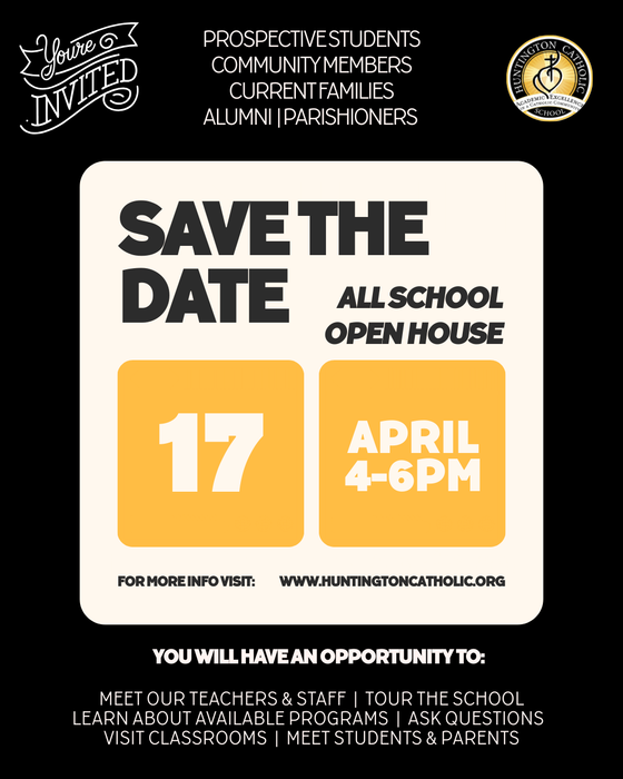 Come out & join us this Friday, April 17 - 4:00-6:00pm! If it’s been a while since you have visited Huntington Catholic School, come to the HCS OPEN HOUSE (Door #1) and check it out, as well as view the school art projects on display before or after you enjoy the Fish & Tenderloin Dinner (St. Mary’s Gym) 4:30-7:30pm! See the flyer for the HCS Open House above on this website!