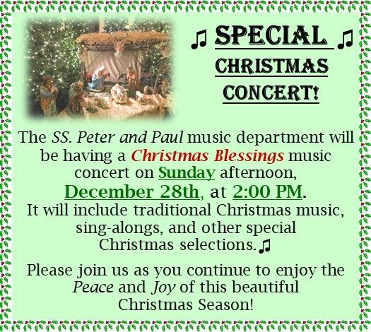 The SS Peter & Paul music department will be having a Christmas Blessings music concert on Sunday afternoon, Dec 28 at 2:00pm. It will include traditional Christmas music, sing-alongs, and other special Christmas selections. Please join us as you continue to enjoy the Peace and Joy of the beautiful Christmas Season!
