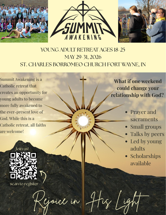 Come experience God's Living Word in a study of the Bible in chronological order beginning with Genesis ideally covering two chapters each week on WED 9:00am in St Mary's Assumption Hall (beginning April 29) and a bible study on the Sunday Mass Scripture readings on THUR 7:40-8:30pm in the SSPP Bl. Fr. Solanus Casey Center. For more information, contact Drew at 260-224-0522.