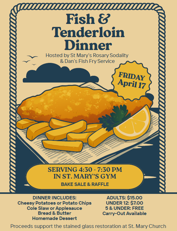 Come out & join us this Friday, April 17 - 4:30-7:30pm! Come enjoy the Fish & Tenderloin Dinner (St. Mary’s Gym). There will be a Bake Sale and Raffle, too! See the flyer posted below on this website.