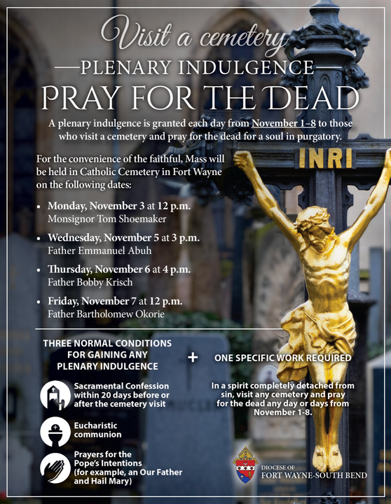For the convenience of the faithful in obtaining this indulgence, Mass will be offered at Catholic Cemetery in Fort Wayne. If the weather is inclement, the Mass will be held in the Resurrection Chapel.