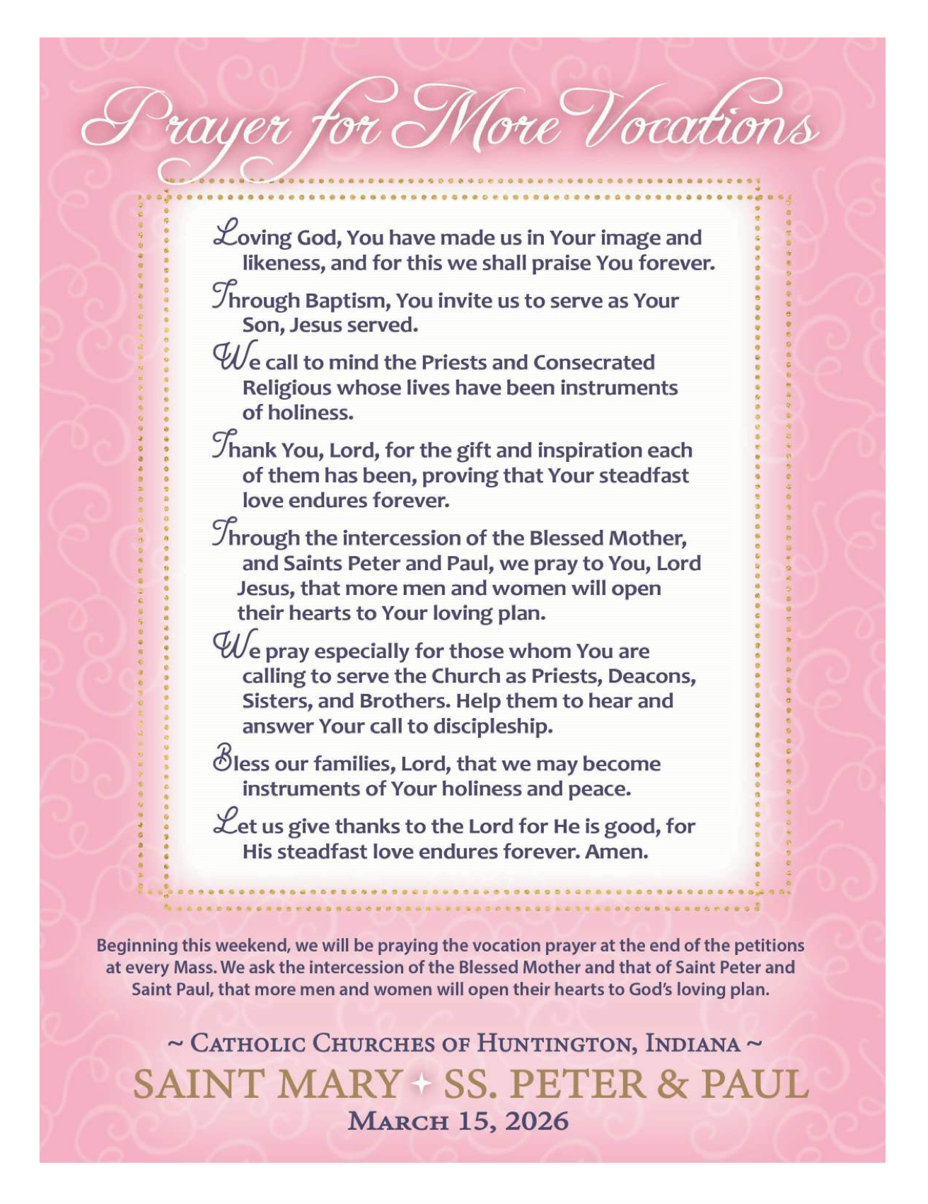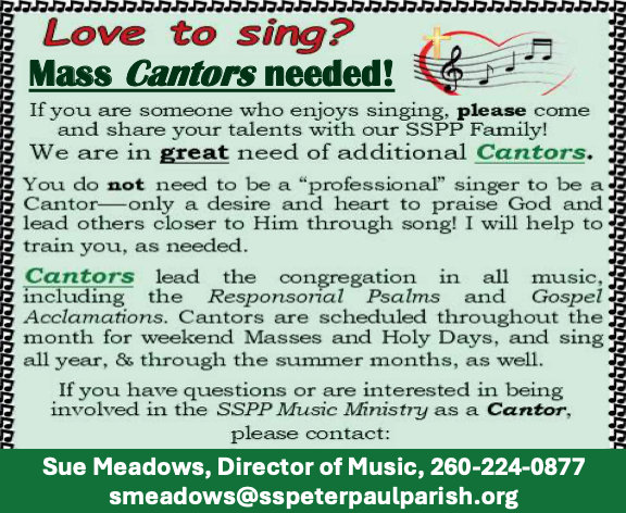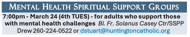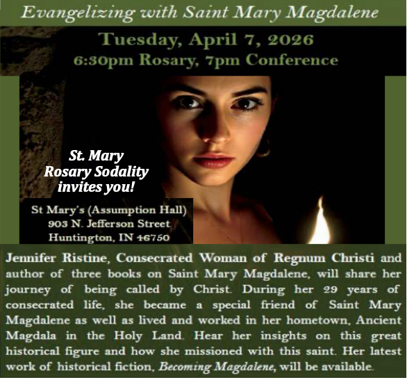 “Now and at the Hour of Our Death” ministry is a NEW ministry being formed at the request of Fr. Tony to support the spiritual needs of those near death and their families within the Huntington County Catholic Community. This ministry will also provide timely assistance when planning a Catholic funeral. We are looking for interested men and women from either parish to be engaged as contributing members of this worthy ministry. If you feel called to serve your brothers and sisters in Christ in this manner and would like to be a member of this ministry or have questions, please contact Doña Reust 574-527-1208.