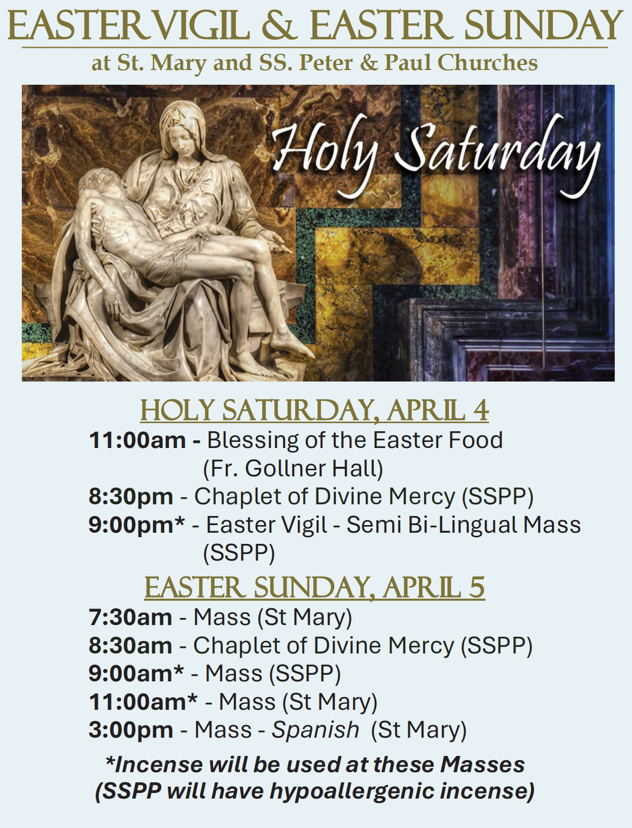 Coffee, Donuts t More at St. Mary... every 2nd Sunday of the Month. Gather and enjoy coffee & donuts with old & new friends on SUN, Apr. 12 after the 11:00am Mass in St. Mary’s Assumption Hall. This ministry is sponsored by the Knights of Columbus and hosted by various ministries of St. Mary & SSPP. Additional parking at McElhaney Funeral Home is available for these gatherings. All Are Welcome!